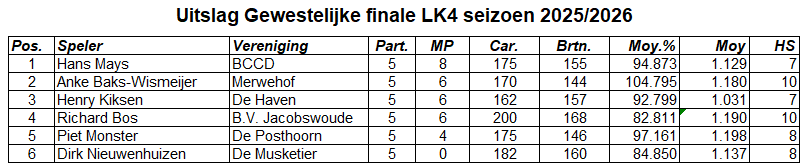 Op zaterdag 15 en zondag 16 november 2025 is in onze BCCD biljartzaal de gecombineerde districtsfinale LK4 en LK5 gespeeld, die ook door BCCD werd georganiseerd/gefaciliteerd door wedstrijdleiders Loek Zijlstra en John Bos. De finale was bijna volledig een BCCD aangelegenheid. Slechts één van de deelnemers was geen BCCD lid, namelijk J. Vermeulen die (in tegenstelling tot wat op het deelnemersoverzicht hieronder staat) lid is van W.B.D.