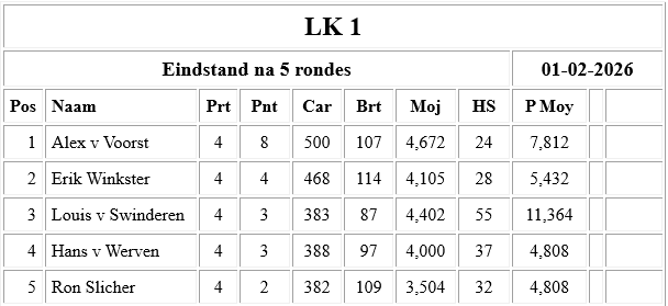 Voor LK5 waren er 3 deelnemers, 2 van BCCD: Monique van Grol en Christina de Romijn en 1 deelnemer van WbD: JJ Vermeulen. In deze klasse die alleen in ons district wordt gespeeld is het aantal caramboles 30 en een limiet van 60 beurten.